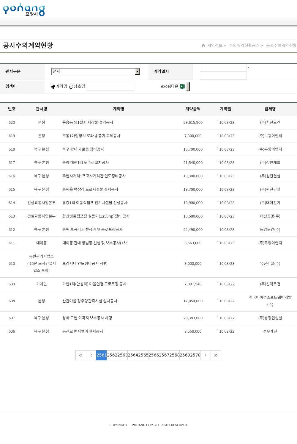 | 320 | 본청 | 형산강둑(종합운동장~연일대교) 가로등 설치공사 | 71,000,000 | `10 02/20 | (주)성광 |