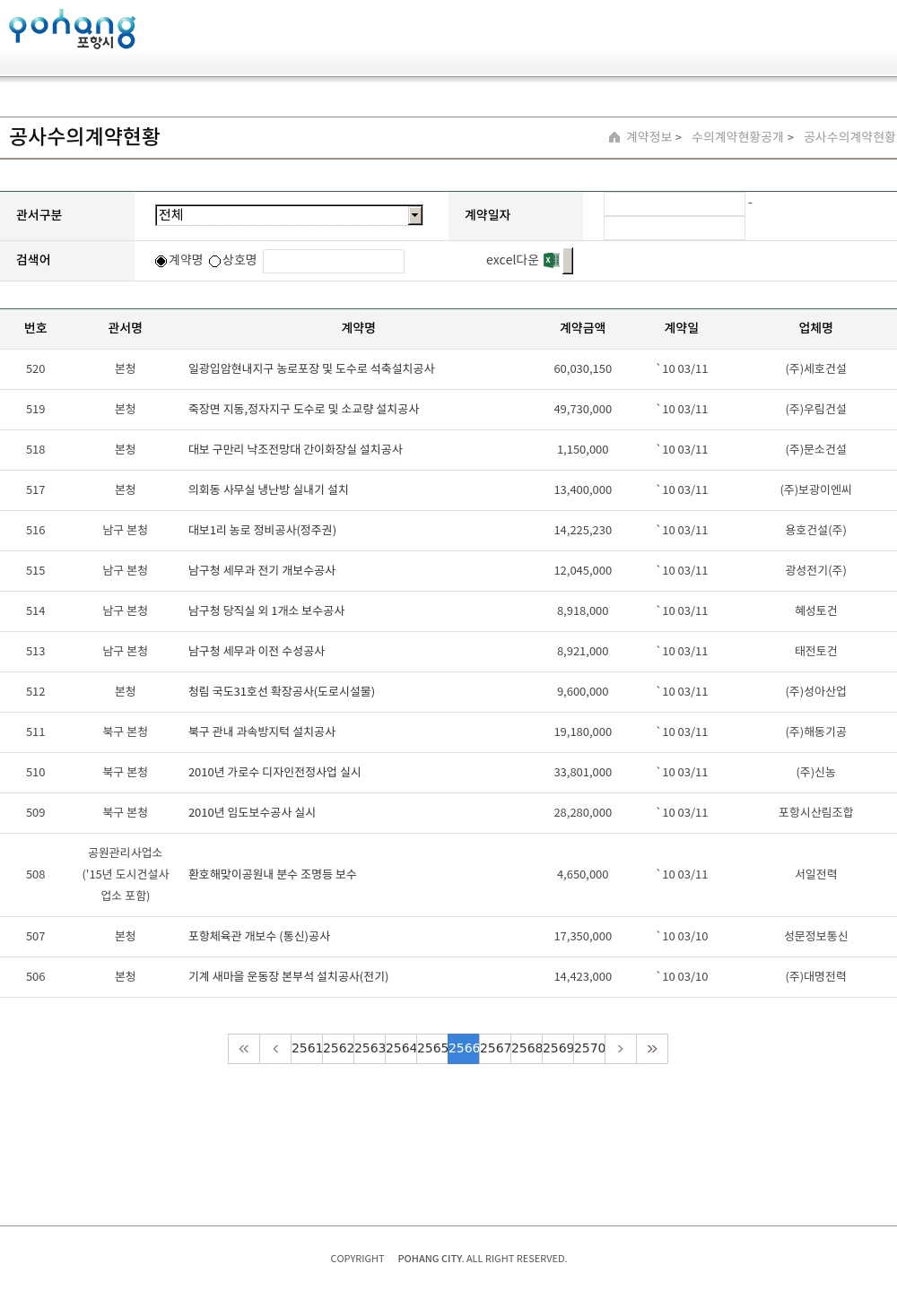 | 246 | 남구 본청 | 장기면 산서리 농로포장공사 | 12,204,000 | `10 02/10 | 봉산건설(주) |