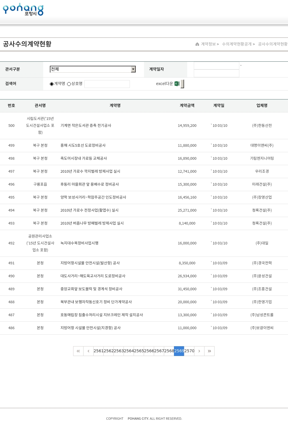 | 202 | 남구 본청 | 대송 장동리 용배수로 설치공사 | 9,860,000 | `10 02/04 | 정산건설(주) |