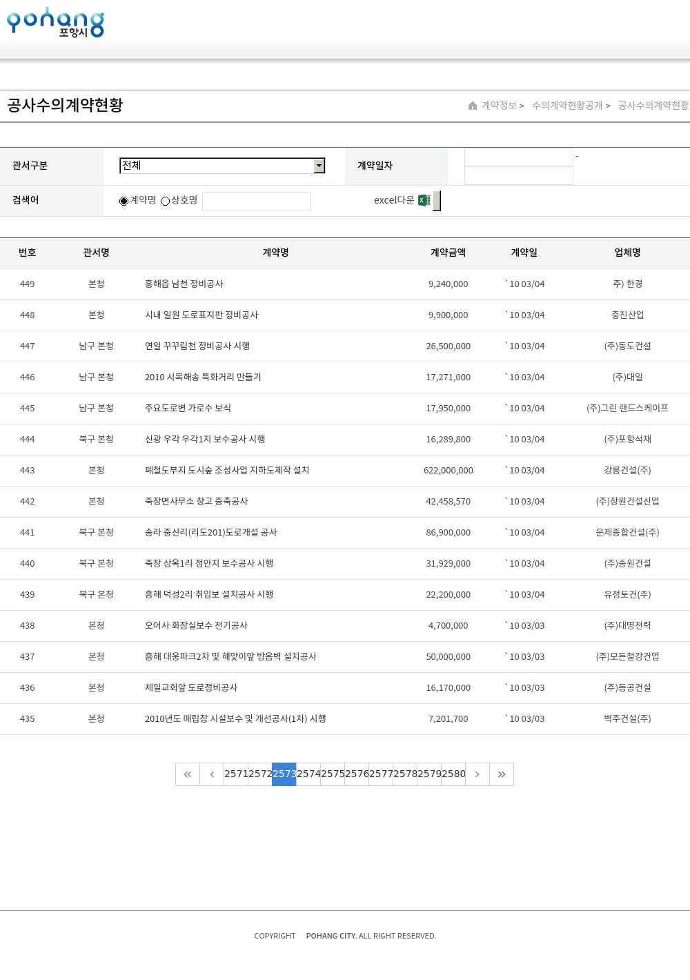 | 146 | 본청 | 장기 청천1리 진입로 정비공사 준공금 | 18,645,000 | `10 01/29 | 선재건설(주) |