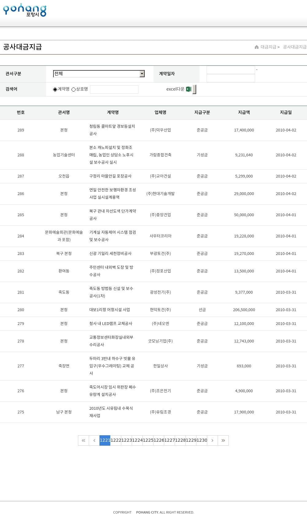 | 71 | 본청 | 형산강 철봉 수리 및 사격장 배관 동파 부분 수선 | 대명산업 | 준공금 | 1,470,000 | 2010-02-17 |
