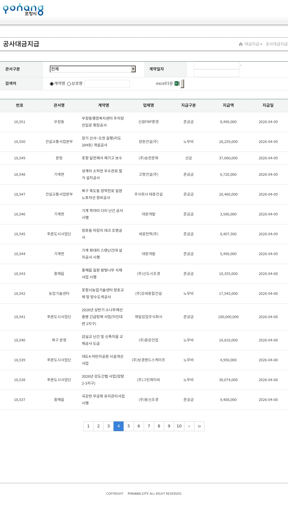 | 18,331 | 본청 | 포항철강산단 침수피해 예방사업 공사 | 동영건설 주식회사 | 기성금 | 374,000,000 | 2026-02-13 |