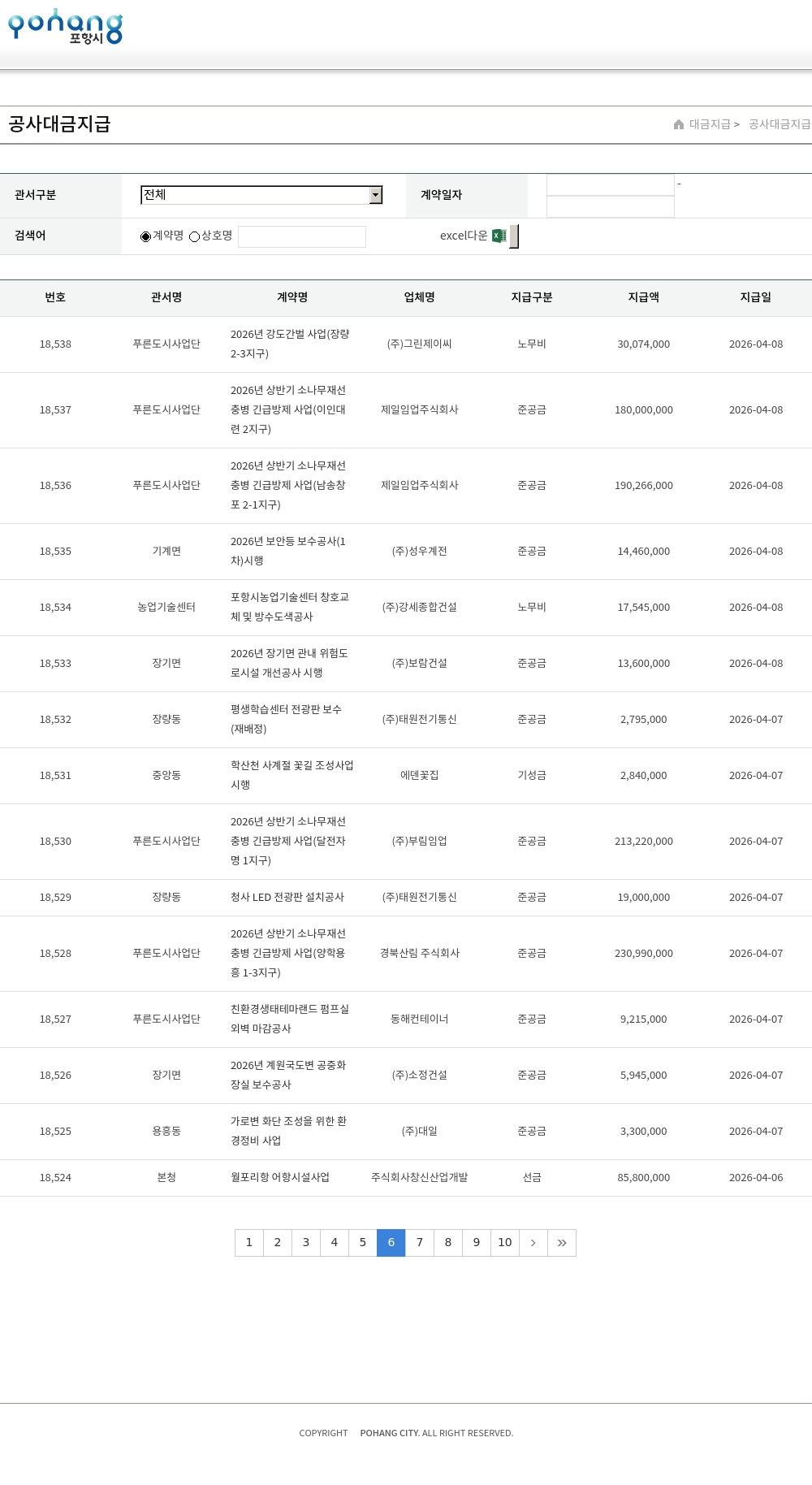 | 18,308 | 건설교통사업본부 | 포항시 건강생활지원센터 건립(리모델링) 건축공사(1차수) 시행 | (주)태건건설 | 노무비 | 25,196,160 | 2026-02-10 |